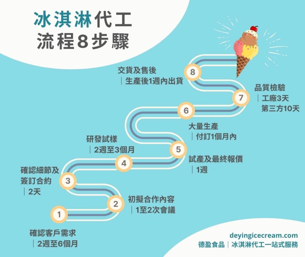 冰淇淋研發時間平均約 1 至 2個月,德盈編輯會建議客人可於前一年的 9 月至 12 月就著手研發,隔年 1 月至 4 月進行代工生產,這樣就能夠在 4 至 9 月的冰淇淋季有充分的貨量及時間來銷售商品。